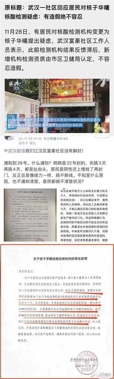 2022年12月初,核子华曦曾公然“入驻”武汉市常青街富豪社区,遭到业主强烈反对,但其检测资质由武汉市区卫健局审核认定,街道社区无权变更……