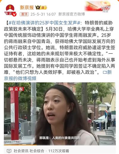 意思是,“咱们这些留学生来到哈佛,说明是爱美国的,愿意为了美国的普世价值而努力的,结果美国却这样对外我们?这叫我本将心向明月,奈何明月照沟渠”。