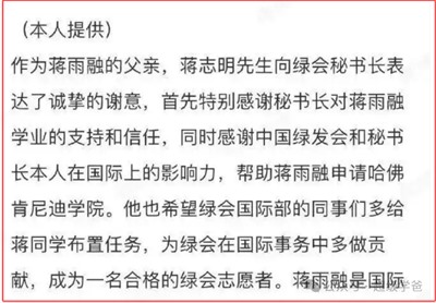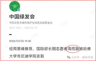 蒋雨融这个名字,出现在2022年中国绿发会的文章中。文章公开报道,绿发会公开推荐她进入哈佛肯尼迪学院,她父亲蒋志明在文章评论区表达了对绿发会的感谢。