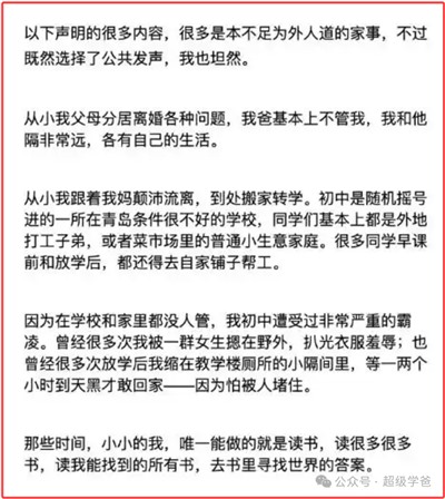 说自己小时候父母就离异,从小跟着妈妈过着颠沛流离的生活,爸爸对自己不管不顾。在初中的时候自己经常被霸凌,曾被同学扒光了衣服……