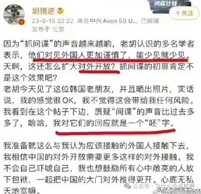 而在中国,公知群体以及如胡锡进之流的媒体人,他们不知道这几十年来中国被美西方间谍严重渗透的事实吗?不,他们比谁都清楚,甚至来说他们之中的一大批人本就是渗透者或者被收买者,但是,如此严峻的事实,他们这个群体有过呼吁要警惕吗?有过宣传要坚守我们的革命传统和意识形态战线吗?可以说,这几十年来被媒体吹捧的一个也没有这样的呼吁,这本身已经证明了我们的意识形态被严重渗透的现实。不仅如此,当我们国安机构发出要警惕间谍的提示时,胡锡进之流屡次三番的唱反调,就这样的一种认知,还敢厚颜无耻的说自己心底无私,心底无私是用来解释反对国家反间谍吗?这是长得一张什么脸?真正无私的人,只会双手赞成国家反间谍反叛徒!
