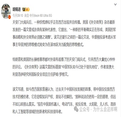 看微博热搜,又出现了那个令我无比讨厌的名字----胡锡进,与其说这是一个名字,不如说这是一种很不好的象征,那就是,这种思维中惯于维护”西方秩序‘的所谓”理中客“在中国依然有着极大的话语权和影响力,所以,如果说惊慌,这个群体给中国人民带来的是“惊慌”,而给美西方等带来的一直是“安心",甚至是”希望“,而在这次阅兵之后,美西方一定会更加的加深这样的”希望“。