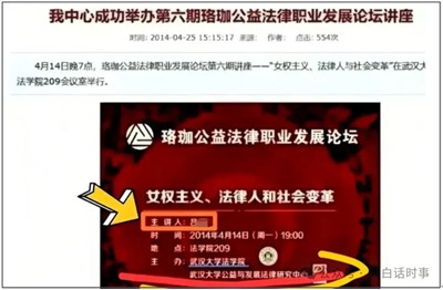 该大学法学院在2014年就邀请了有名的极端女权主义吕某,举行《女权主义、法律人与社会变革》的讲座。