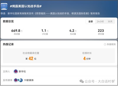 但这篇报告,在社交媒体上,阅读量却很低,新华社亲自发的话题,仅仅只有19家媒体参与。