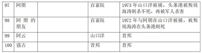 阿姗被抓进去后,被打得死去活来,衣服被脱光了从这个办公室出来又被拉到另一个办公室打,甚至两手吊着打。不给阿姗穿衣服,真是没有人性,后来隔壁的男难友,偷偷塞一件衫给阿姗,连短裤都不给她穿。过了一段时间以后比较放松了,阿姗等能到厨房洗澡了,阿姗见到了嫦桃。她是在特别一个房间被监禁的。嫦桃对阿姗说,她已先得知领导人雄民叛变的消息了,因为和雄民在一起的交通员曙光看见雄民被捕,不久无事被放出来很自由,没受刑和监禁。但大家还不敢相信他变质做内奸,只是有人已开始怀疑他,一直叫人监视他。雄民的一个女友是外人,他经常带她去看戏、逛逛街,去花钱浪费,钱花完了,便向村干部以组织的名义东骗西讨。