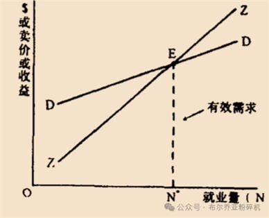在N为既定的情况下,预期价格大于总供给价格即D>Z,那么企业家就会将就业量增加到大于N的位置,一直到N得数值使得D=Z为止,而总供给函数和总需求函数相交时(如下图交点E)此时企业家利润达到最大化,这个相交点的值称之为有效需求。