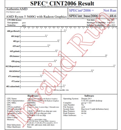 (gcc,int_base 48.6。测试过程中频率基本保持在 4GHz,也就是说 IPC 为12/G,由于测试还有调优空间,及5600G的缓存要比5600X少一半,可以认为调优后的Zen3可以达到13/G)